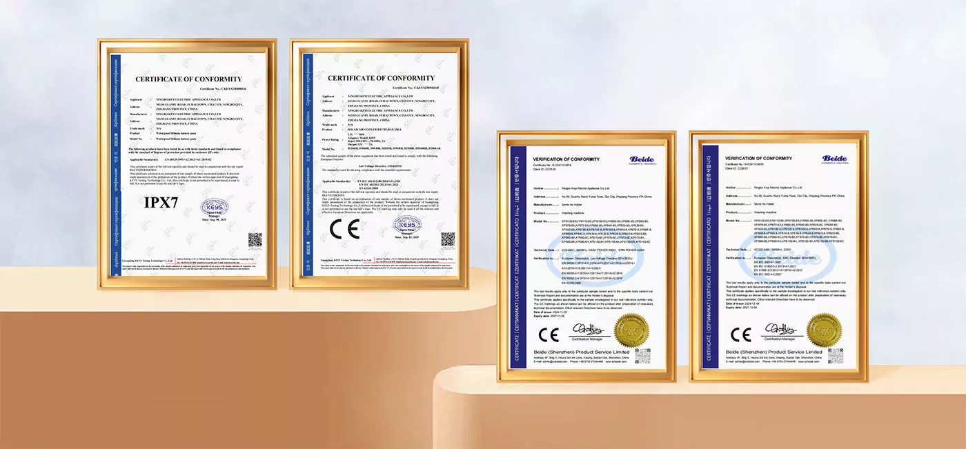 Nostra ablutio machinis et aeriis coolers signa EU signa probandi et certificationem CE adeptus est. Pugna gloriatur IPX7 IMPERVIUS rating. Etiam certificati sumus sicut egregius venditor in suggestis e-commercii domesticis et Alibaba.